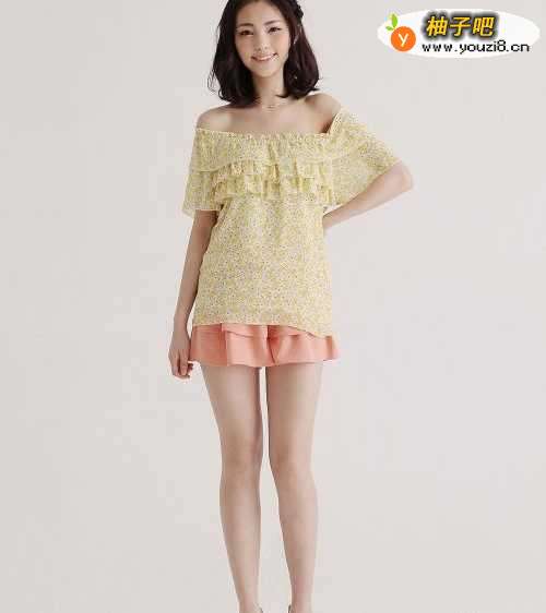 3既然下半身偏胖,那么就要想办法拉长下半身的线条。高腰裙装不仅具有收腰的效果,还能趁机拉长腿部线条。略带斗篷味道的荷叶边,视觉上遮掩了上半身过瘦的现象,用小小的露肩顺利转移注意力,凸显腰部的窈窕。