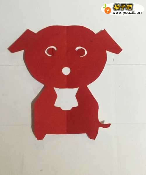 6第六步 剪掉小狗外围多余的彩纸之后 再剪出小狗的眼睛 鼻子嘴巴 领结和尾巴以及无线修边等等 剪好之后 展开铺平 一只可爱的小狗狗就裁剪完成了