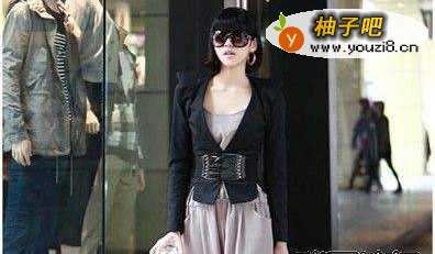 5松紧式腰带立体肩袖的粉色金属扣上装,搭配蛋糕边直筒裙,以金属扣蕾丝腰带束腰,诠释熟女的减龄复古Look,打造X-line凸显腰部线条。
