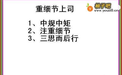 2第二,如果对于上司很注重细节,连办公桌面的清理都要管理,那么就应按公司的要求中规中矩地工作,多关注一些细节,凡事都要三思而后行。