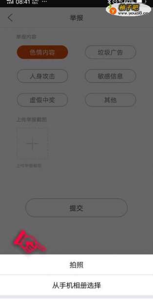 4之后在进入的界面,选择举报的内容,在点击一下举报截图,如图所示。