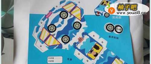 2用剪刀沿着虚线将越野车的零部件剪下来。