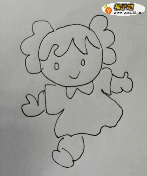 7第七步,最后在乖巧的小女孩子的裙子下面画出乖巧的小女孩子的两条腿。乖巧的小女孩子就画好了。