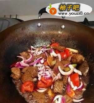 待牛肉上色均匀后,把洋葱丝、西红柿块倒入锅中。翻炒均匀,最好能用锅铲捣压一下西红柿,使西红柿能软化容易些。