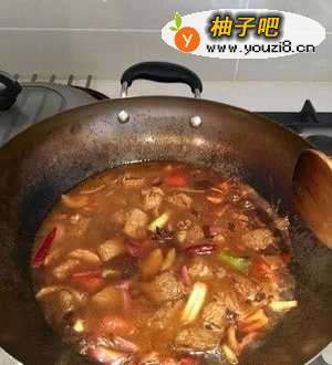 热锅倒油。油热后,放入切好的葱姜蒜爆香,加入干辣椒段。倒入腌制好的牛肉,翻炒片刻,加入八角、料酒、少许生抽老抽。