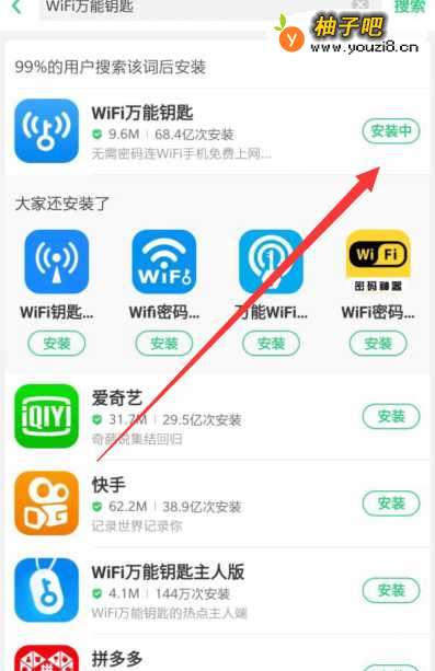 3我们能看到匹配出的第一个应用便是我们要找的“wifi万能钥匙”。我们点击后方安装按钮,进行安装。
