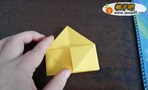 2我们把角撑开成了个正方形,然后,其他的角同样执行。接下来,我们再把正方形的两边向内折,如图三。