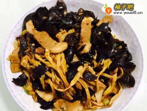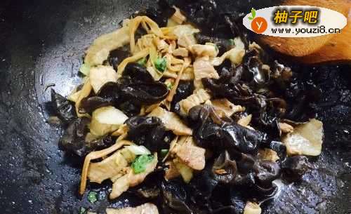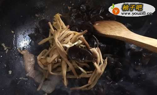 5肉片都上色之后倒入木耳和黄花菜,继续翻炒。