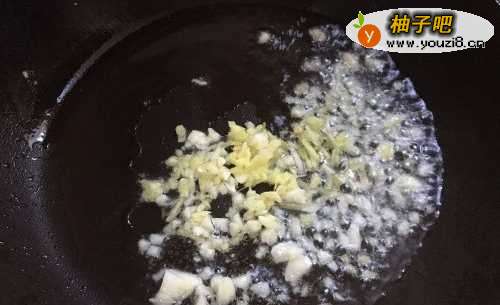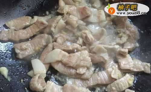3锅烧热放油,油热了之后先放入姜蒜煸香,然后放入肉片煸炒。