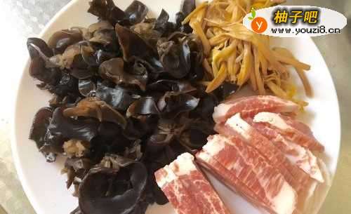 2泡发好的黑木耳和黄花菜洗净备用,木耳能用刀稍微切一两刀,前腿肉切片备用。生姜和打算切成沫备用。