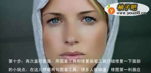 10再次盖印图层,用图章工具和修复画笔工具仔细修复一下面部的小斑点;