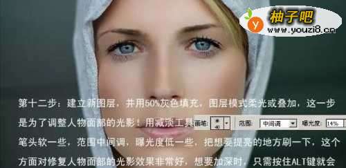 12新建一个图层,用50%灰色填充,图层模式改为“柔光”或“叠加”,这一步是为了调整人物面部的光影。用减淡工具,笔头软一些,范围中间调,曝光度低一些,把想要提亮的地方刷一下,这个方面对修复人物面板的光影效果非常好,想要加深时,只需按住Alt键就会自动变换回加深工具,用这个图层来做加深,减淡的好处是能反复修改;