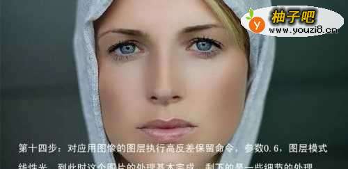 14对应用图像的图层运作:滤镜 > 其它 > 高反差保留,参数为0.6。图层混合模式为“线性光”。到此时这个图片的处理基本完成。剩下的是一些细节的处理,如唇线、眼线等;