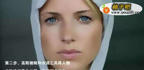 2用高斯模糊和水滴工具(模糊工具)将人物皮肤进行柔化处理,直至斑点小时。人物边缘和眼睛、眉毛不能处理;