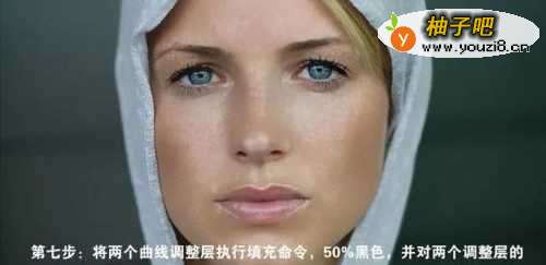 7将两个曲线调整图层运作填充命令,50%黑色;并对两个调整层的蒙版部分进行两次0.5的高斯模糊,以柔化选区的边缘;