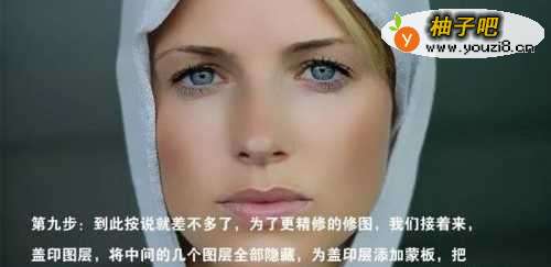 9到此按说就差不多了,为了更精确的修图,我们接着来盖印图层。将中间的几个图层全部影藏,为盖印图层添加蒙版,把不是皮肤的地方擦回来,这样更真实一些;