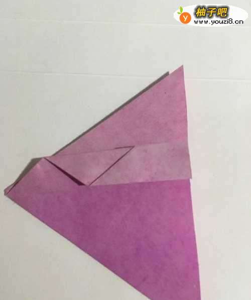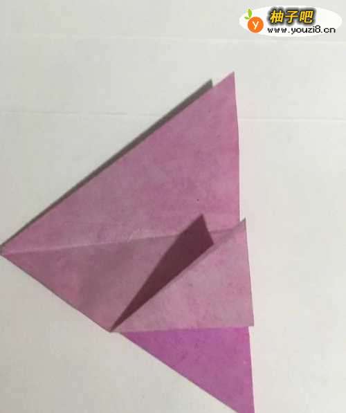 4第四步 折叠完之后 向上翻过去 再向下对折至折痕 然后取开 按折痕 向里折再向外再出一个小双三角 其它几个同样折叠
