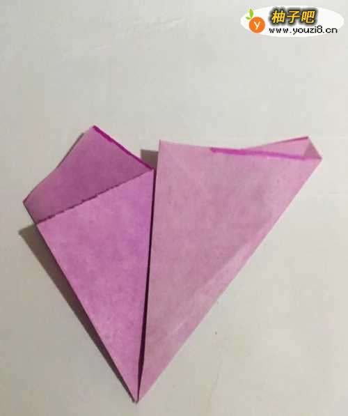 6第六步 折叠完平放 大头在左 把左下角和右下角都向中线折叠 其它每一个角一样折叠 然后拿起来取开花瓣向外卷曲一下就行了