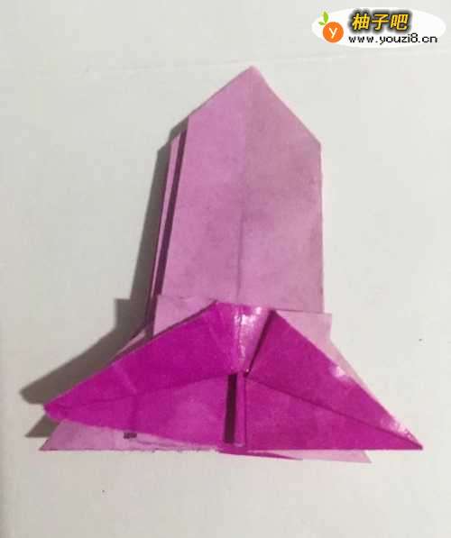 5第五步 几个三角折完完之后 再把它竖起来 大头在下 掀起两个中间的小角向上翻折 同时折出花瓣中间的折痕 两边一样 其它几个角一样折叠