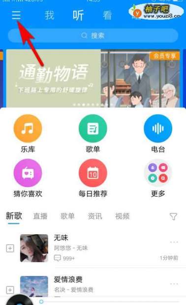 首先开启酷狗音乐,点击左上角的“三”菜单。