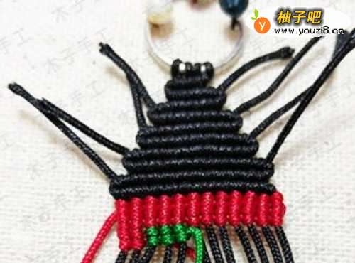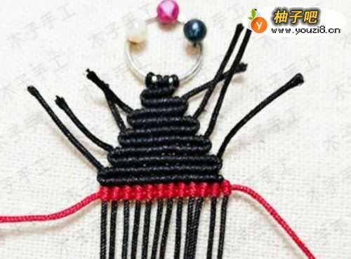 11最后这根红色线拉到左边来做轴,12根黑色线为绕线做一排斜卷结,把下面这一排12根线穿入珠子后,所有的线头全部剪掉烧粘好,房子挂件就做好了。