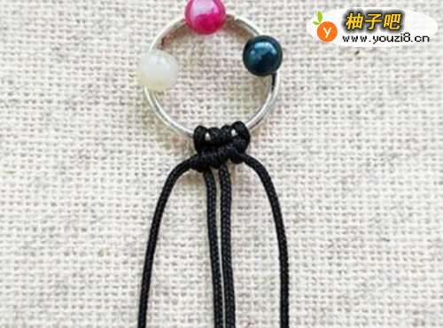 首先取两根80cm的黑色72号玉线用雀头结挂在15mm的小圈上,把最右边的线拉左边来做轴,其余3根线为绕线做斜卷结。