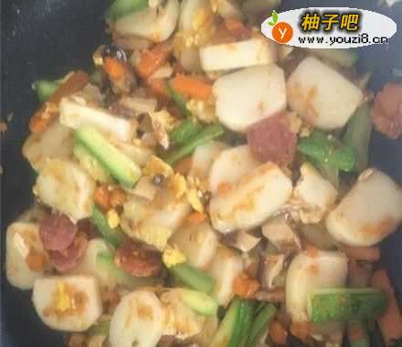 将年糕从水中捞出,倒入锅中,不断翻炒,差不多好的时候加入适量的盐,然后继续翻炒直至所有食材熟透入味,试吃味道差不多就可起锅了。