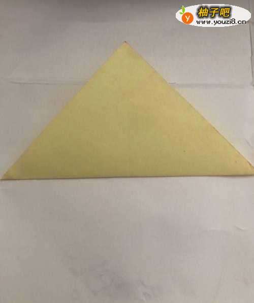 第一步 首先取一张16厘米长X16厘米宽的正方形黄色彩纸 先把它从下向上对角折叠整齐