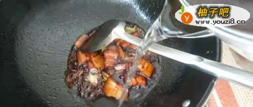 5把焯好水的肉放下去,(小心不要被糖浆溅到)翻炒至每块肉上都沾有焦糖色。