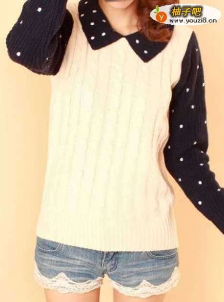 2上衣我们挑选波点毛衣娃娃领衬衫,白色的底,黑色的袖子,很有清纯学生妹的感觉。
