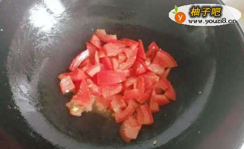 5再倒入准备好的西红柿丁,继续进行翻炒。