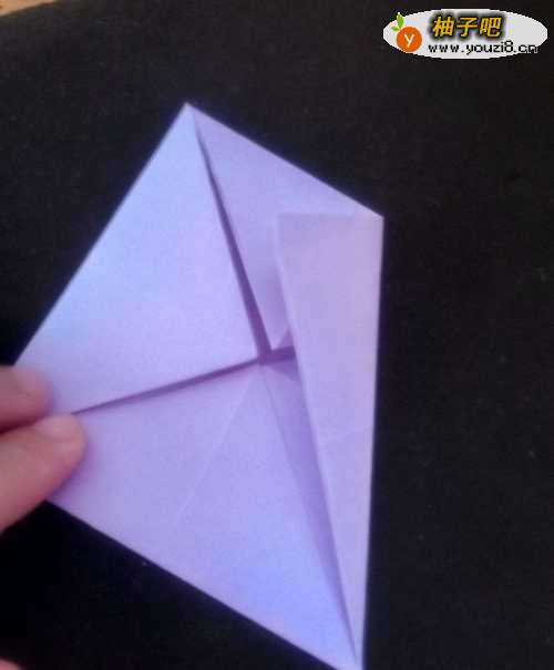 6第5步完成后就能看到一个长长尖尖的三角形内中间还有一个正的三角形,然后在把这个长长尖尖的三角边对边对折,得出一个小的三角形