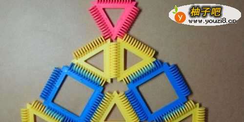 6然后拼装愤怒的小鸟的尾巴部分。由两个三角形积木所组成,摆放的位置,如下图所示。这样一个愤怒的小鸟积木拼装画就做好了。