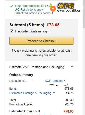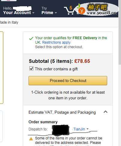 5值得一提的是,欧洲的亚马逊邮寄商品是互通的,当然要支付一点点的运费。通常德国法国寄往英国的运费会稍微贵一点。但是很多商品是无法直接邮寄中国的,检查该商品是否能邮寄到中国,在购物车最下面就能显示如图,我地址选择天津,但是亚马逊会报告该商品无法运往天津。