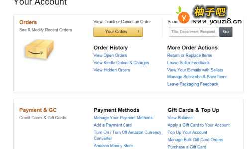 3登录成功后,进入My Account界面,这个里面是您常用的亚马逊功能,比如历史订单浏览。个人地址信息浏览编辑,给亚马逊账户充值等等。。