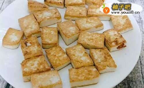 3原锅放入切块的板豆腐,煎至两面金黄后取出盛入盘中。