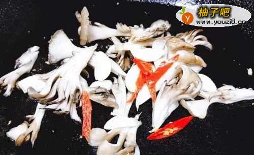 4原锅不放油先煸香舞茸,再加入蒜片、辣椒爆炒。