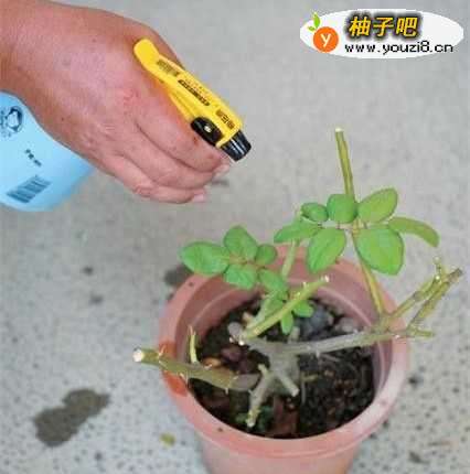 6种植物完成后可用水壶在玫瑰枝叶或枝干上喷少许的水,在泥土上撒上几粒的肥料后在浇水在泥土与肥料上,看到盆底有水流出就能了
