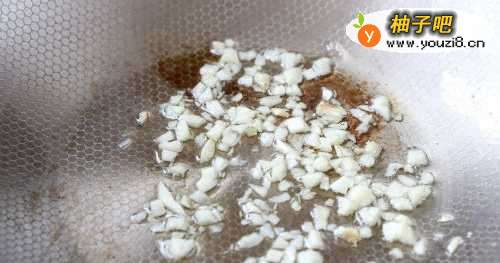 5另起锅放入色拉油,放入大蒜炒香;放入扁豆翻炒均匀;