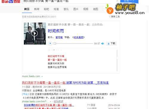 2然后迅速拿出手机,用百度引擎搜索这句“我们说好不分离,要一直一直在一起”,出现了如图所示的结果。原来是《时间煮雨》,《小时代》的主题曲,之前看电影的时候听过了,我说怎样那么熟悉。