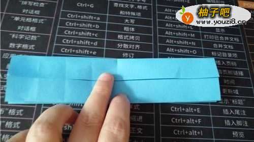 2再把下侧的边继续上折,如图一。展开后,把彩纸转一下,把下侧的边上折,如图三。