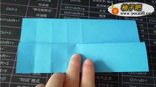 4把下侧的边向着中线翻折,下侧的边继续上折,如图。