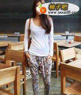 2印花哈伦裤,甜美和酷如影随形,只要随意套上白色TOP,甜美度DOUBLE升级,棕色大包,甜美不忘通勤