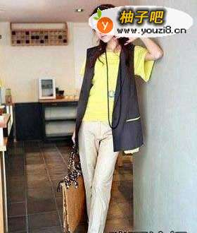 4黄色T恤搭配长马甲,显出几分硬朗的味道,而裤腿卷起的设计让你的纤细脚踝与宽松的裤管形成鲜明对比,立刻造成纤细美腿的效应,高跟鞋更是拉长了腿部线条,让你看起来更为高挑