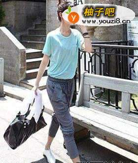 1灰色哈伦裤搭配湖蓝色宽松TEE,从9分上行,耍酷正当时,搭配浅湖蓝色宽松TEE,碧波荡漾,学院女孩青春无需耍酷便已酷到爆