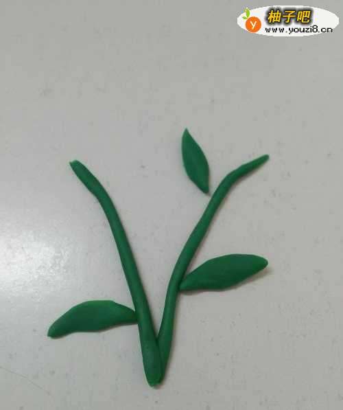 2用绿色搓三个细长的椭圆形,用手按成扁片,当作三片叶子,把三片叶子粘在花茎上。