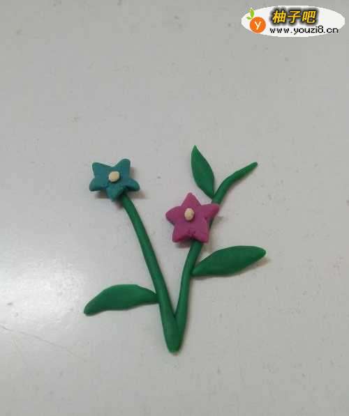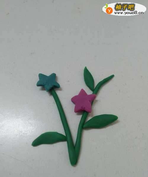 6将两个星星形状的小花分别粘在两根花茎的中间和上方。