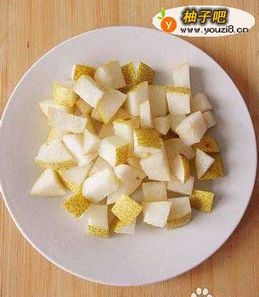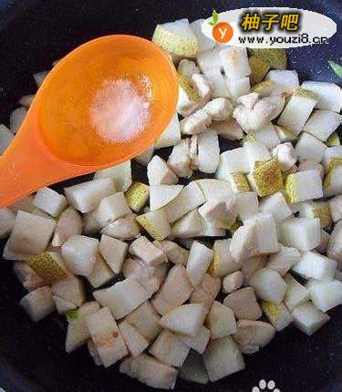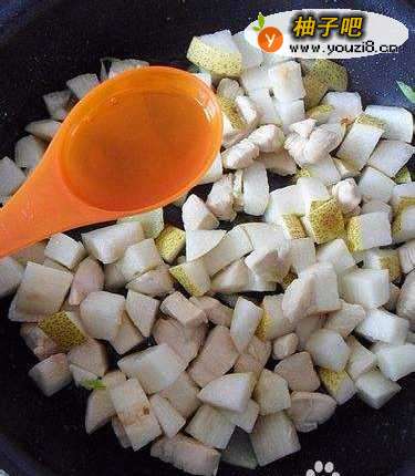 9翻炒变色后,把梨和山药一起放入炒匀,加入料酒1勺。