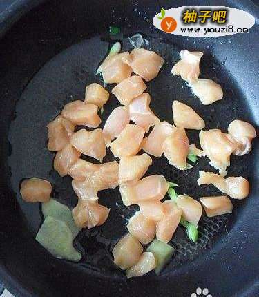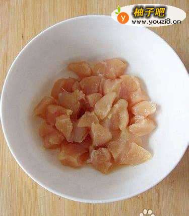 5鸡胸肉解冻好好,也切成小块状。加入少许盐,和料酒,白胡椒粉腌制5分钟左右。