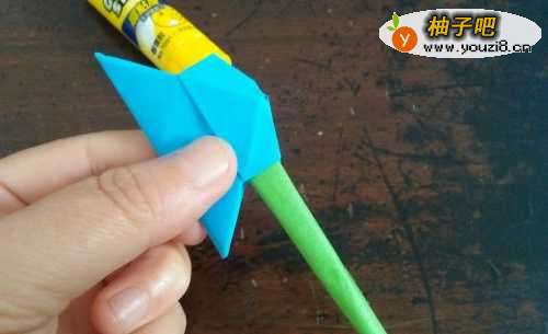 5再把彩纸从中间对折,我们用长方形的彩纸卷成一条长棍,用胶棒把边缘粘住,插进先前的折纸里。